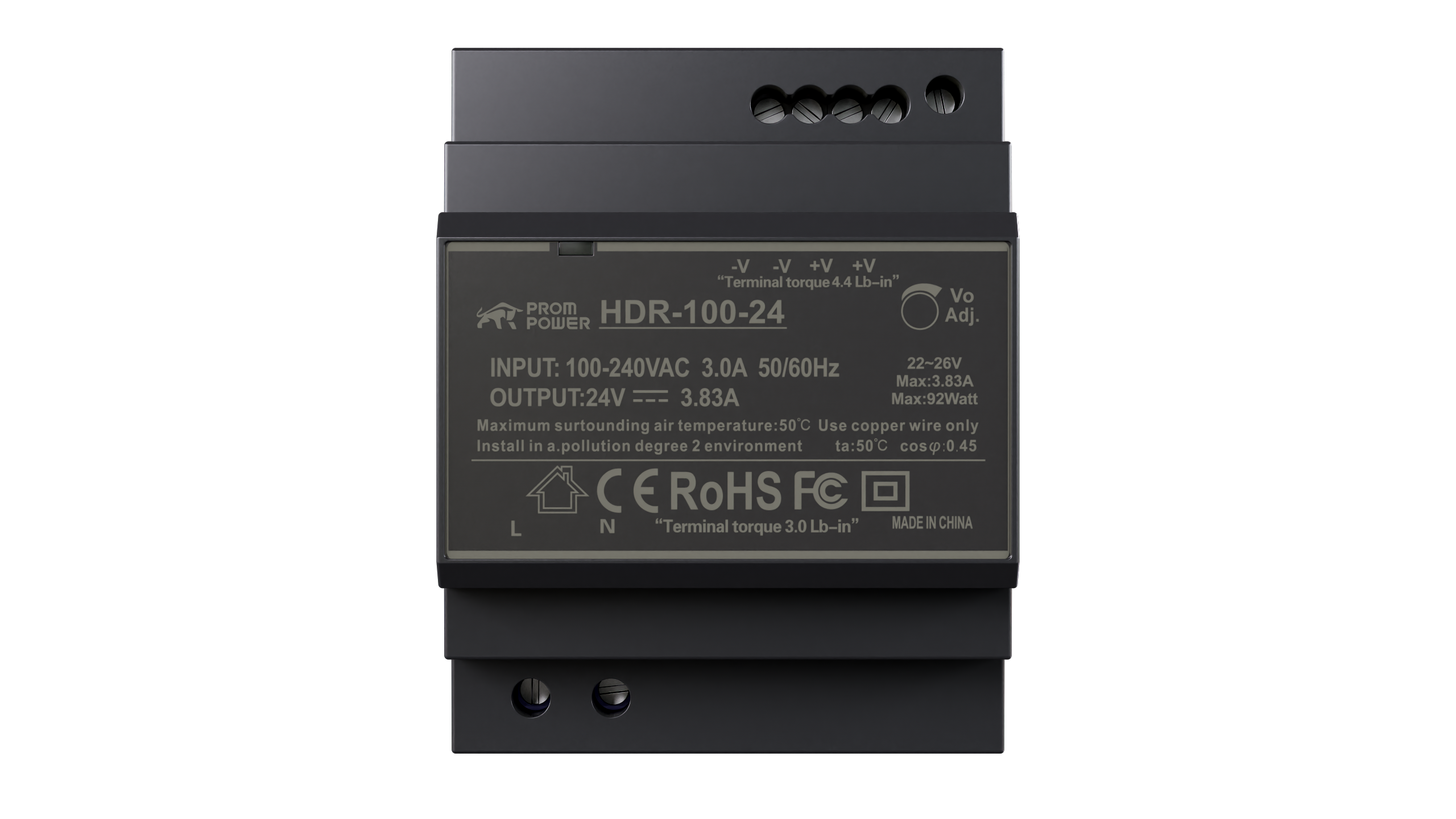 - Источник питания PROMPOWER HDR-100-24, на вых. 24 В DC, 3.83А, 92Вт. Вх. 85-264В AC (120-370 В DC)